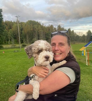 Ofta hittar ni mig tillsammans med min Lagotto Romagnolo, Fia. Vi brukar ta cykelturer i närområdet och stannar gärna till vid klubben för en vätskepaus, lite nosework eller lydnadsträning. Det är en härlig plats att landa på – både för två- och fyrbenta.